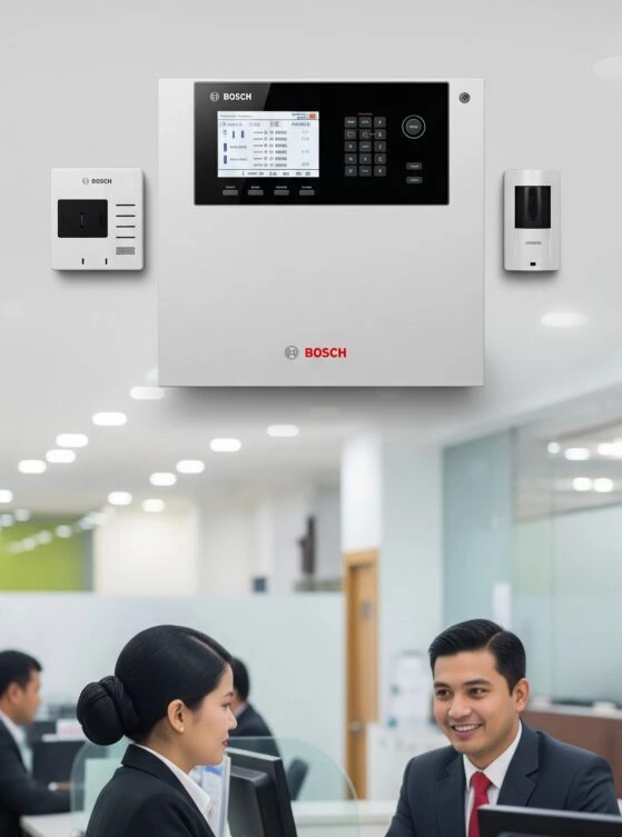 A system where alarms from multiple bank branches are connected to a central monitoring station, allowing immediate response coordination.